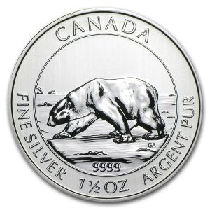 На реверсе изображен могущественный полярный белый медведь, а снизу вес монеты и содержание чистого металла.