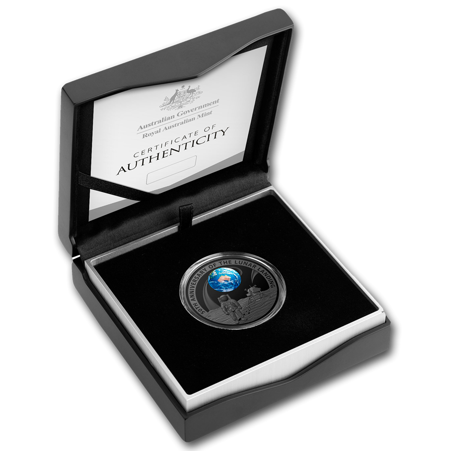 Серебряная монета от Королевского монетного двора Австралии, посвященная 50-летней годовщине высадки человека на лунную поверхность.
