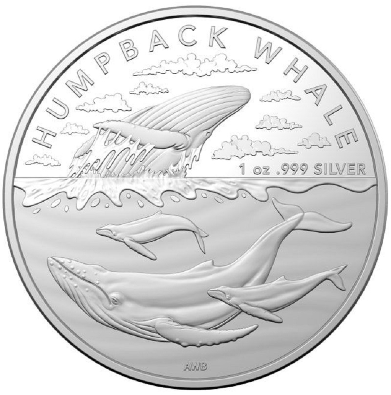 На реверсе изображен потрясающий вид четырех горбатых китов. Один выходит на поверхность, а мать и двое ее детенышей плывут внизу. Название монеты «HUMBACK WHALE» расположено по всей верхней половине обода, а прямо над волнами находится надпись о весе и чистоте монеты: «1 oz 0,999 SILVER».