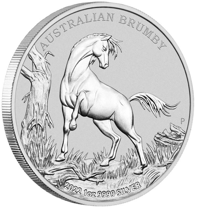 На реверсе изображен брамби с поднятой ногой рядом с деревом. Справа у канта монограмма Пертского монетного двора Р, ниже инициалы дизайнера JM (Jennifer McKenna). Вдоль канта надпись: AUSTRALIAN BRUMBY 2022 1oz 9999 SILVER (австралийский брамби, год чеканки, вес и проба серебра).