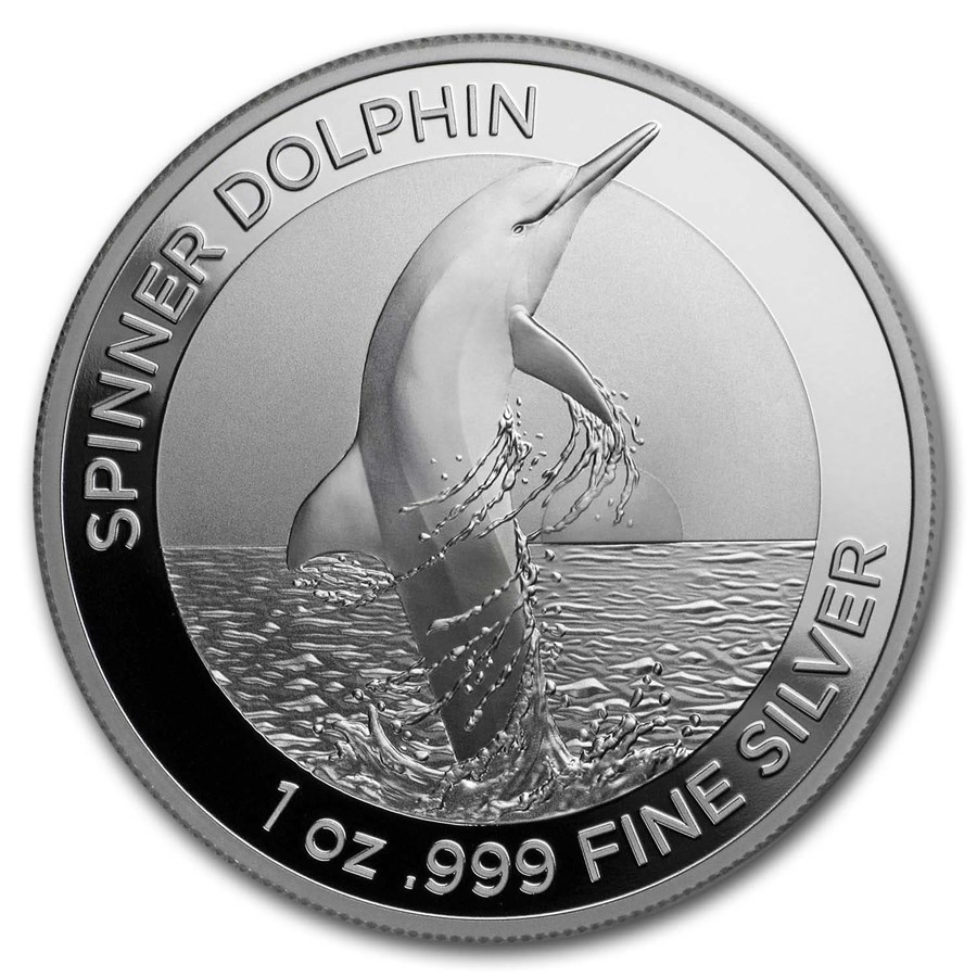 Изображение дельфина-афалины, выпрыгивающего из воды на фоне горизонта. Вес и чистота металла ниже.