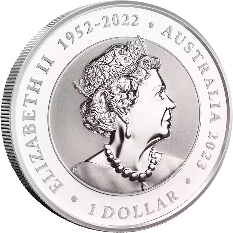 На аверсе монеты изображена королева Елизавета II в бриллиантовой диадеме и коронационном ожерелье. На левом плече королевы инициалы дизайнера JC (Jody Clark, Джоди Кларк). Вдоль канта надписи: ELIZABETH II 1952 - 2022 · AUSTRALIA 2023 · 1 DOLLAR · (Елизавета II и её даты правления, страна-эмитент, год чеканки, номинал).