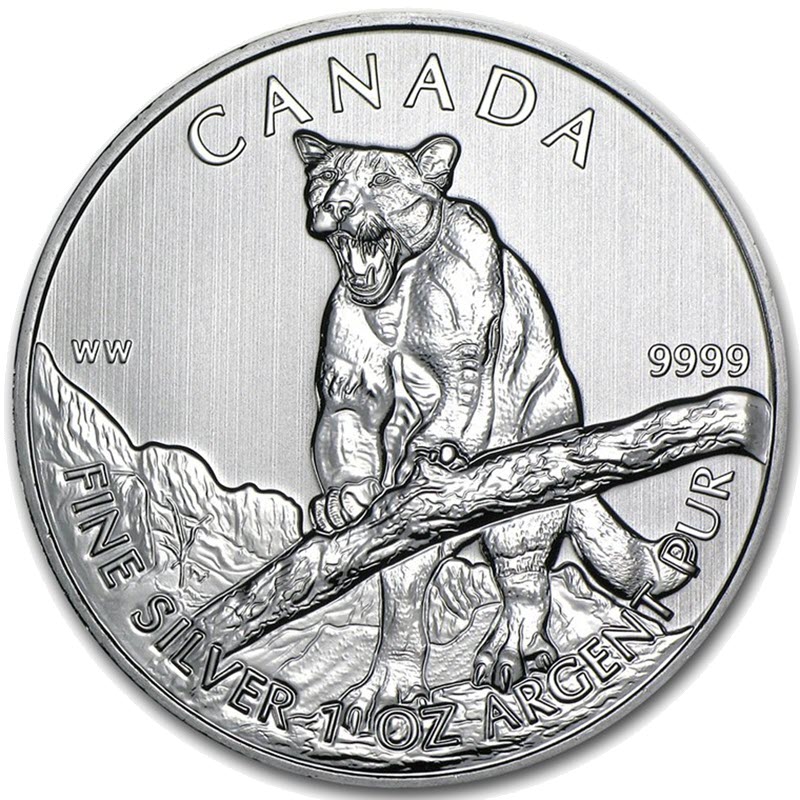 На реверсе монеты изображена Пума, поставившая передние лапы на упавшее дерево и показывая грозный оскал своих клыков. Сверху отчеканена надпись CANADA - Канада и проба серебра - 9999. Внизу, по окружности монеты надпись на английском - «FINE SILVER 1 OZ» и на французском – «ARGENT PUR», что в переводе означает «Чистое серебро 1 унция».