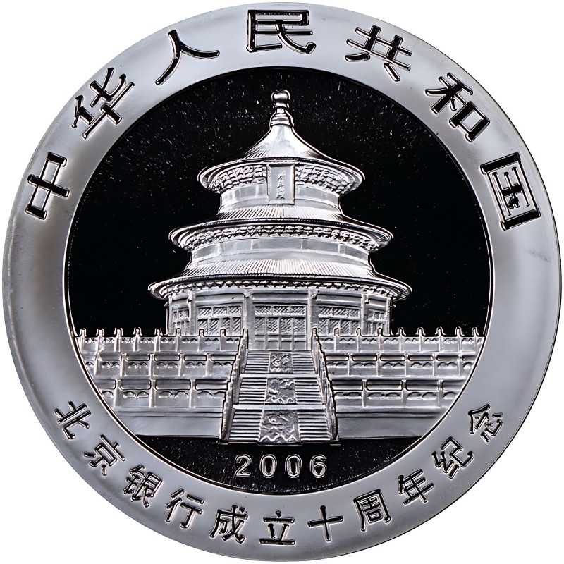 На аверсе изображен Храм Неба, часть Всемирного наследия ЮНЕСКО с 1998 года. Вверху вдоль канта иероглифы: 中华人民共和国 (Китайская Народная Республика). Внизу надпись - 北京银行成立十周年纪念 (В честь 10-летия со дня основания Банка Пекина), 2006 (год чеканки).