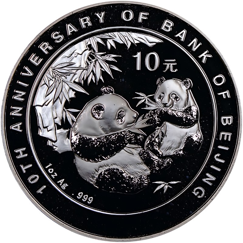 На реверсе изображены две сидящие панды на фоне бамбука, жующие бамбуковые листья. Вокруг изображения надписи: 10TH ANNIVERSARY OF BANK OF BEIJING (10-летие Банка Пекина). Вверху справа: 10元 (номинал). Внизу слева: 1oz Ag .999 (вес и проба серебра).