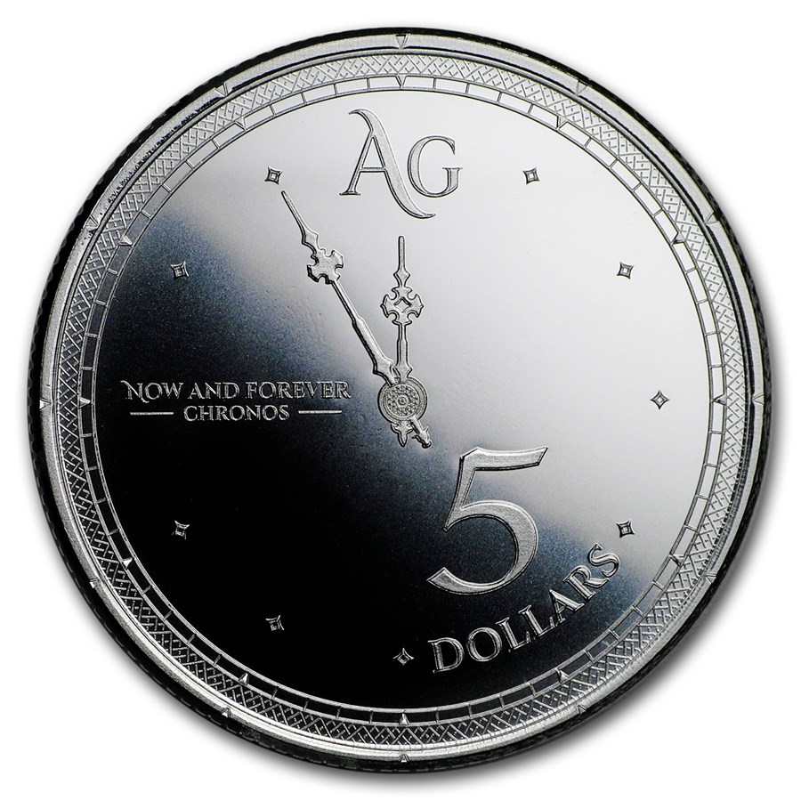 Изображен часовой циферблат с орнаментом, показывающий время 5 минут до 12:00. Номинал в $ 5 расположен в районе 5 часов, а цитата «СЕЙЧАС И НАВСЕГДА» на отметке 9 часов. 12-часовая отметка показывает "AG", что является латинским сокращением для Argentum.