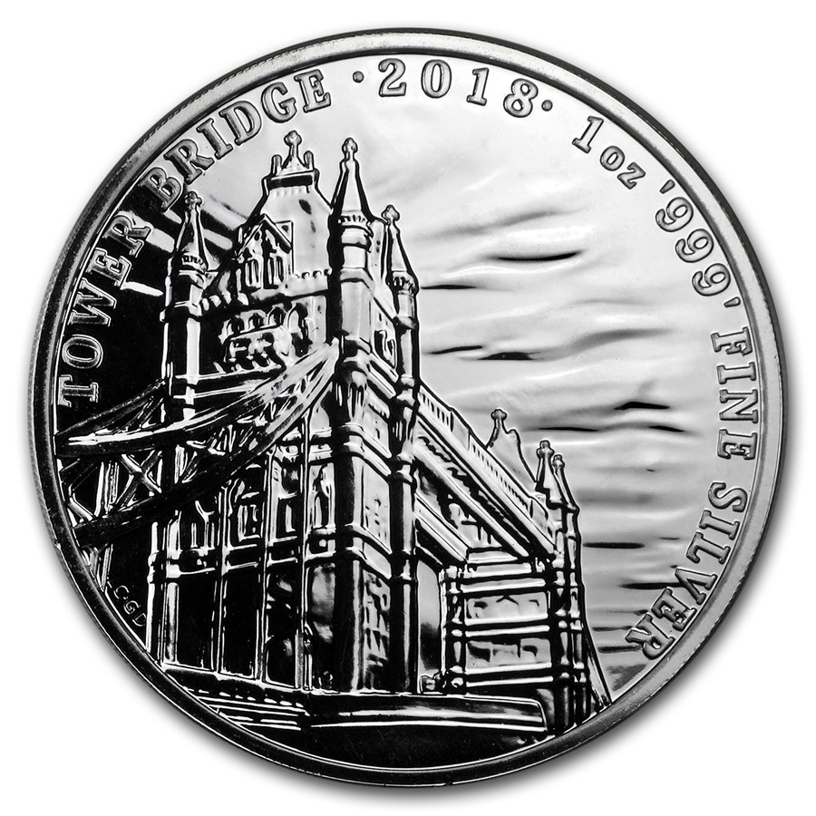 На реверсе изображен Тауэр-бридж на фоне неба; взгляд на Тауэр-бридж является взглядом прохожего с улицы. По ободу стоят следующие надписи: «TOWER BRIDGE 2018 1 oz 999 FINE SILVER» (Тауэр-бридж, 2018 год, 1 унция чистого серебра 0,999 пробы).