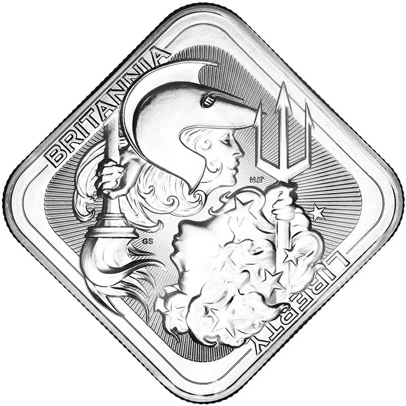 Серебряный жетон Великобритании «Британия и Свобода» - результат новаторского партнерства между Королевским монетным двором и Монетным двором США. Гордон Саммерс и Джозеф Менна, главные граверы этих монетных дворов, вместе разработали дизайн жетона. Дизайн объединяет национальные символы Британии и Свободы, физическое воплощение «особых отношений» (фраза, придуманная сэром Уинстоном Черчиллем в 1946 году) между Соединенным Королевством и Соединенными Штатами. У него размеры 35 х 35 мм. Тираж: 70 000 штук.