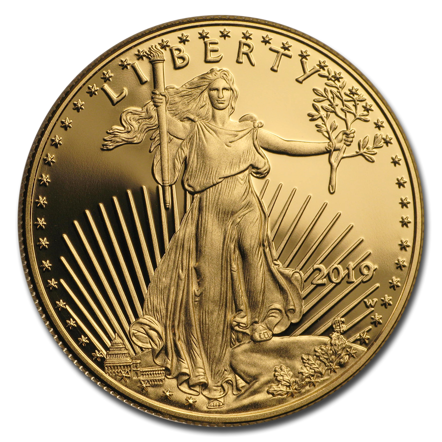 Эта золотая инвестиционная монета была впервые отчеканена в 1986 году. Ее проба равна 22 каратам (916,7 частей золота), содержание чистого золота в монете составляет 1 тройскую унцию (31,1 грамма), а сама монета весит почти 34 грамма. По закону золото для изготовления Американского орла должно быть добыто в США. В составе сплава монеты содержится серебро и медь для придания монете прочности и долговечности.