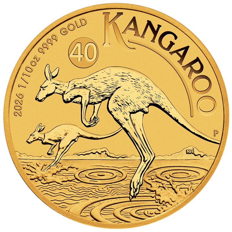 На реверсе изображены два кенгуру, прыгающих по воде на фоне горного пейзажа. Справа у канта инициалы дизайнера NH (Neil Hollis) и монограмма Пертского монетного двора Р. Над кенгуру отметка с числом 40 (юбилей). Вверху вдоль канта надпись: 2026 1/10 oz 9999 GOLD KANGAROO (год чеканки, вес и проба золота, кенгуру).