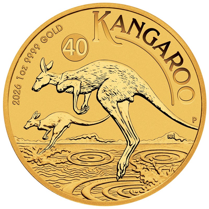 На реверсе изображены два кенгуру, прыгающих по воде на фоне горного пейзажа. Справа у канта инициалы дизайнера NH (Neil Hollis) и монограмма Пертского монетного двора Р. Над кенгуру отметка с числом 40 (юбилей). Вверху вдоль канта надпись: 2026 1oz 9999 GOLD KANGAROO (год чеканки, вес и проба золота, кенгуру).