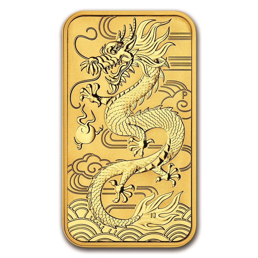 Стилизованный китайский дракон, преследующий пылающую жемчужину, с ветром, облаками и водой на заднем плане. Дизайн, также, включает в себя монетный знак «P» Монетного двора Перта.