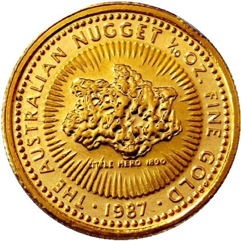 На реверсе изображен самородок «Маленький Герой». В нижней части самородка инициалы дизайнера: SD (Stuart Devlin). Под самородком надпись: LITTLE HERO 1890 (самородок, дата находки). Вдоль канта надпись: THE AUSTRALIAN NUGGET 1/10 OZ. FINE GOLD · 1987 · (серия, вес и проба золота, год чеканки).