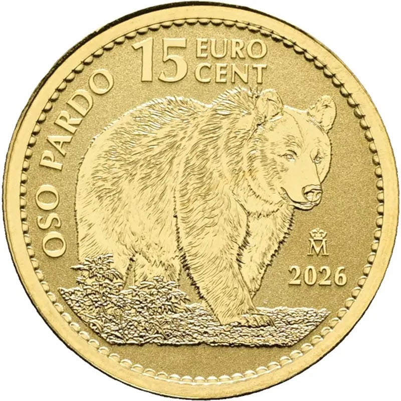 Золотая монета «Бурый медведь» 2026 года от Королевского монетного двора Испании. Это пятая золотая инвестиционная монета с изображением знаковых животных Испании. У нее качество анциркулейтед. Поставляется в капсуле. Тираж: 10 000 штук.