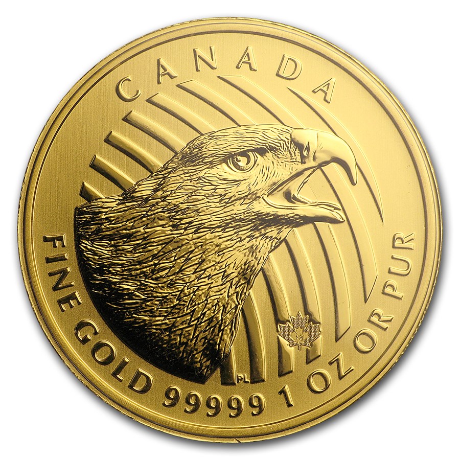 На реверсе изображен орел с открытым клювом, готовый поймать добычу. Внизу по ободу помещена надпись: «FINE GOLD 99999 1 OZ OR PUR» (1 унция золота пробы 0,99999 или чистого золота), вверху указана страна-эмитент – «CANADA» (Канада).