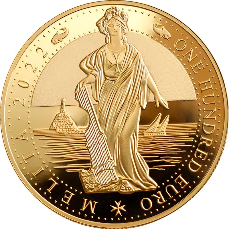 На реверсе изображена Мелита в плаще и шлеме, держащей руль корабля, символизирующий Мальту как страну, контролирующую свою судьбу. На груди у неё мальтийский крест. Фоном служит морской пейзаж с маяком возле форта Сент-Эльмо и лодкой с острова Гозо. Вдоль канта надпись: MELITA · 2022 ONE HUNDRED EURO ✠ (Мелита, год чеканки, номинал).
