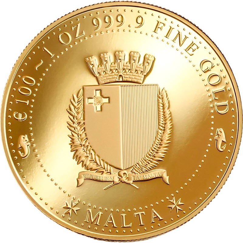 На аверсе изображен герб Мальты. Треугольный щит, над щитом корона в виде башни с пятью зубцами. Герб окружен оливковыми и пальмовыми ветвями, символами мира и природы Мальты. Внизу на ленте надпись: REPUBBLIKA TA' MALTA («Республика Мальта» на мальтийском языке). Вверху, в окружении двух дельфинов, надпись: €100 ~ 1 OZ 999.9 FINE GOLD (номинал, вес и проба золота), внизу: ✠ MALTA ✠.