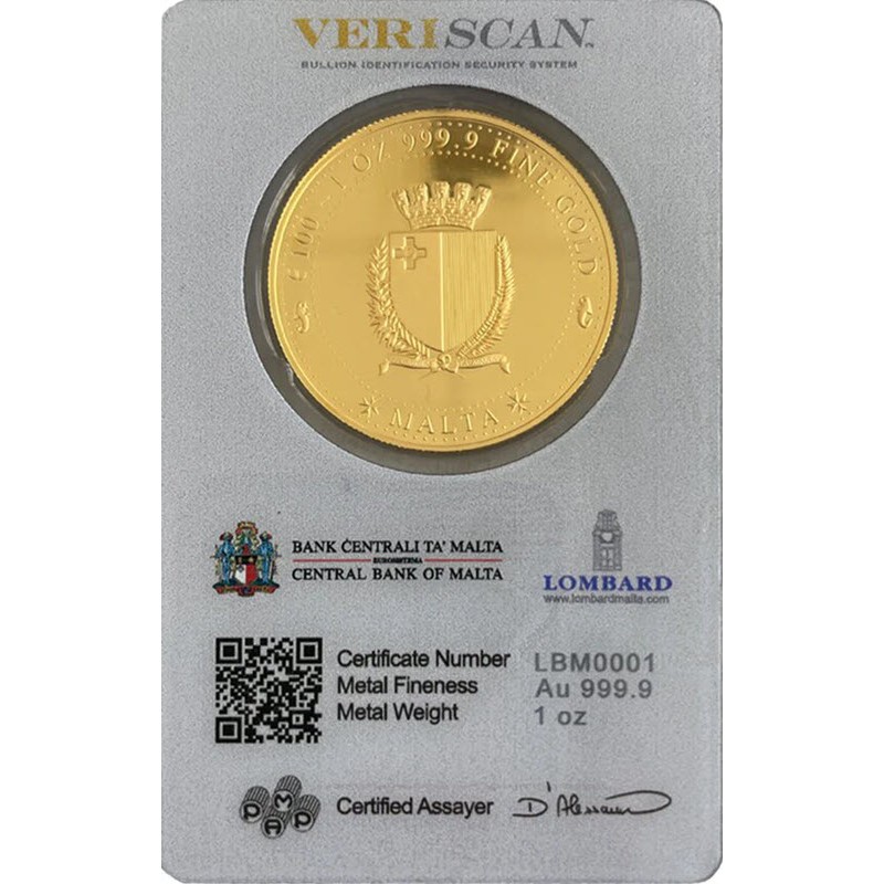 Золотая инвестиционная монета «Мелита» от Центрального банка Мальты. Отчеканена швейцарским монетным двором PAMP. Согласно конвенции еврозоны, номинал в евро является законным платежным средством только на Мальте, а не во всей еврозоне. У нее качество BU. Поставляется в блистере с сертификатом подлинности.