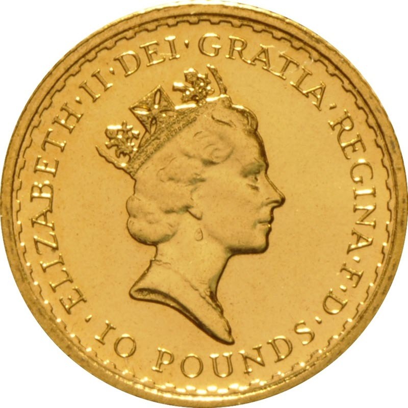 На реверсе монеты - персонифицированный символ Великобритании в виде молодой женщины в коринфском шлеме, с гербовым щитом и трезубцем Посейдона в руке. Легендарная фигура Британии символизирует британскую силу и единство на монетах со времен Римской империи. Фамилия художника NATHAN высечена маленькими буквами на скале под ногами Британии. Вдоль канта надпись: ' 1/10 ' OUNCE ' FINE ' ' GOLD ' ' BRITANNIA ' 1987 ' (вес и проба золота, Британия, год чеканки).