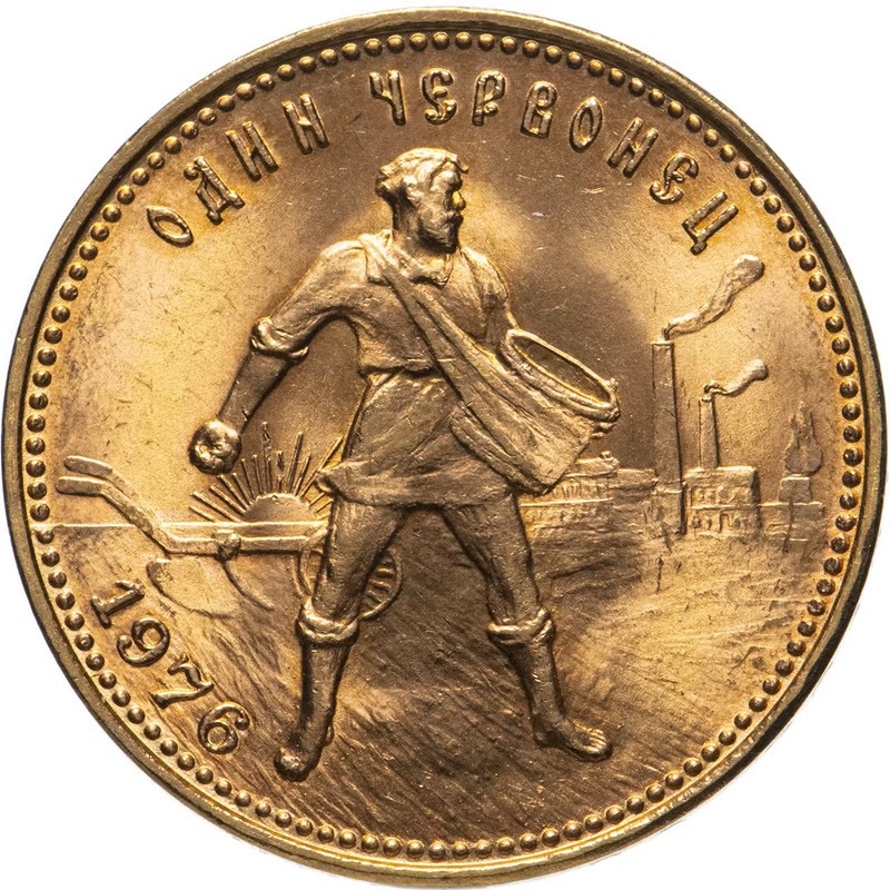 На реверсе изображен крестьянин-сеятель на фоне плуга, восходящего солнца и заводов. Вдоль каната надпись: ОДИН ЧЕРВОНЕЦ 1976 (номинал, год чеканки).