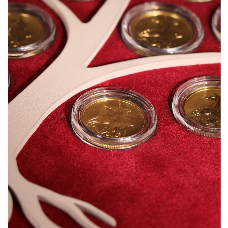 Так возникла задумка, воплотившаяся в чудесный объект, достойный внимания знатоков и почитателей красоты — картинка-шкатулка «Монетный ассамбляж “Древо”». В своей конструкции произведение подобно чудному дереву жизни, ветви которого являются зеркалом судьбы каждого владельца, охраняя самую дорогую ценность — 20 прекраснейших золотых монет «Георгий Победоносец».