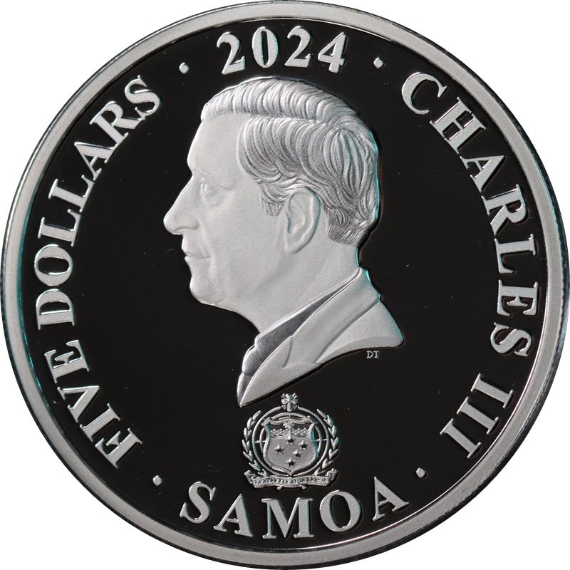 На аверсе изображен Его Величество король Чарльз III. Внизу портрета инициалы дизайнера DT (Dana Thornea). Под портретом герб Самоа. Вдоль канта надпись: CHARLES III · SAMOA · FIVE DOLLARS· 2024 · (Чарльз III, страна-эмитент, номинал, год чеканки).