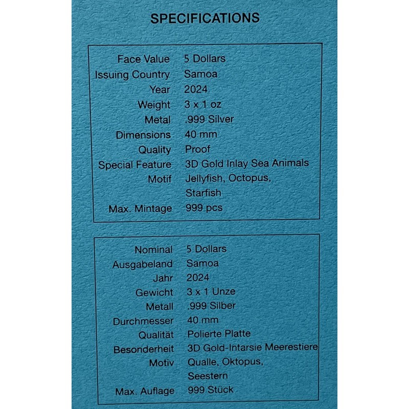 Этот чудесный набор из 3 серебряных монет весом 1 унция каждая посвящен трем существам: медузе, морской звезде и осьминогу. Набор показывает пленительную красоту морских глубин, которые очаровывают разнообразием цветов, форм и поведений. Монеты имеют красивый дизайн, качество пруф с выборочным золочением, поставляются в оригинальном футляре с сертификатом подлинности. Тираж: 999 штук.