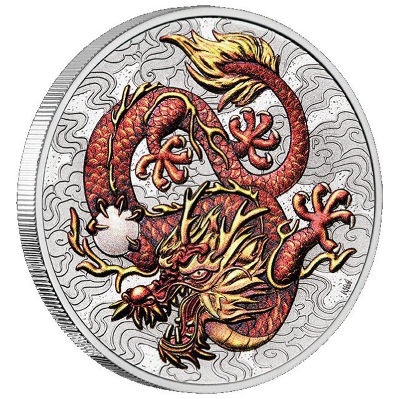 Серебряная монета Австралии "Китайские мифы и легенды. Дракон с пылающей жемчужиной" 2021 г.в. (с цветом), 31.1 г чистого серебра (проба 9999)