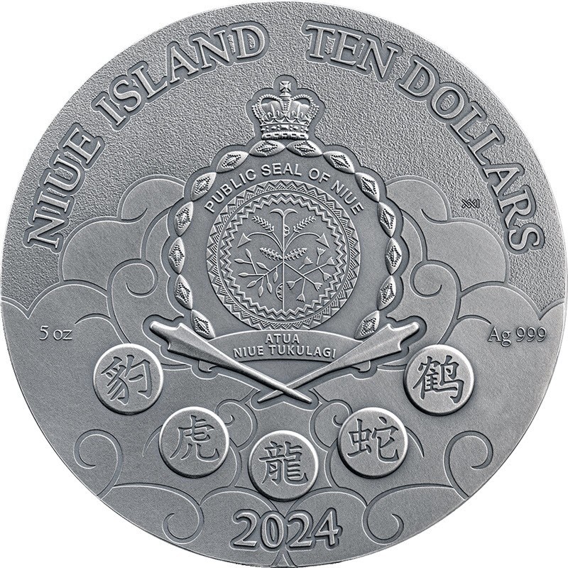 На аверсе монеты изображена неофициальная «Государственная печать Ниуэ». Это композиция из растений в центре внутри двойного декоративного круга, окруженного морскими раковинами. Он увенчан короной Святого Эдуарда (символом Соединенного Королевства, монарх которого в конечном итоге является главой государства Ниуэ). Сверху между ними надпись PUBLIC SEAL OF NIUE. Ниже на ленте в две строки изображен девиз ATUA NIUE TUKULAGI, ниже которых две перекрещенные катуа. Под гербом иероглифы: 豹 虎 龍 蛇 鹤 (стили кунг фу). Вдоль канта надпись: NIUE ISLAND TEN DOLLARS XXI 5 oz Ag 999 2024 (страна-эмитент, номинал, монограмма польского монетного двора, вес и проба серебра, год чеканки).