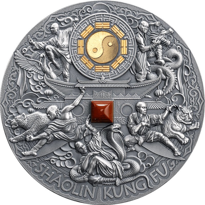 Эта удивительная серебряная монета весом в 5 унций является шестой и последней из серии «Стили боевые искусства» от монетного двора «XXI Century Mint» (Польша), посвященной шаолиньскому кунг-фу. На ней изображены прекрасные горельефы, выборочное золочение и вставка из яшмы. Она имеет античную отделку и поставляется в футляре вместе с сертификатом подлинности. Тираж: 333 штуки.