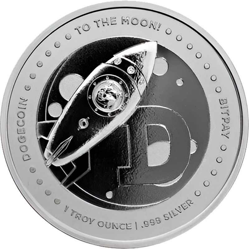 На реверсе в центре круга - изображение собаки, летящей на ракете, что является отсылкой к популярной в криптосообществе фразе «To the Moon!» (На Луну!), означающей ожидание резкого роста цены на криптовалюту. Рядом крупная стилизованная буква D - логотип Dogecoin. По кругу надписи, разделенные точками: DOGECOIN ∙ TO THE MOON! ∙ BITPAY ∙ 1 TROY OUNCE │Oz .999 Fine Silver (валюта, На Луну!, Международный криптопроцессинговый сервис, вес и проба серебра).
