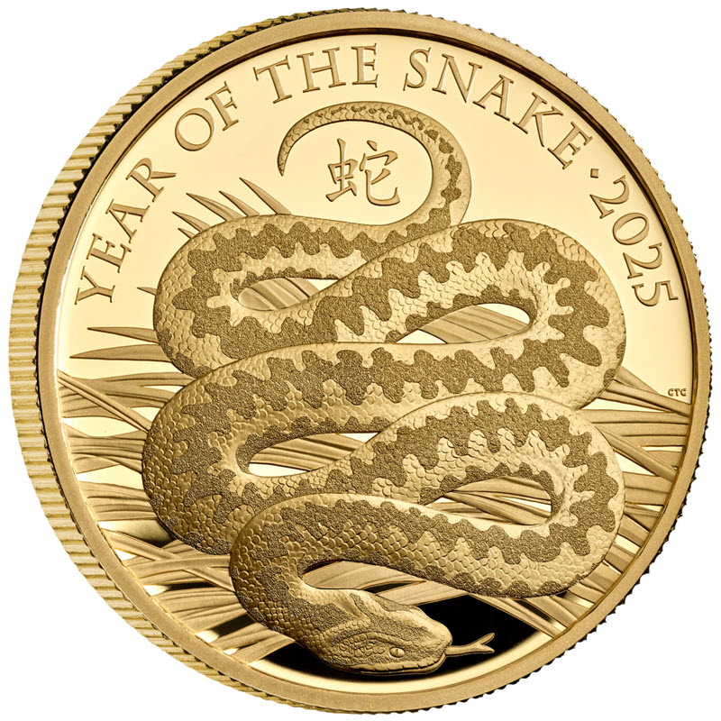Золотая монета от Королевского монетного двора Великобритании весом в 1тройскую унцию посвящена символу 2025 года - Змее. У нее качество пруф. Поставляется в оригинальном футляре с сертификатом подлинности. Тираж: 898 штук.