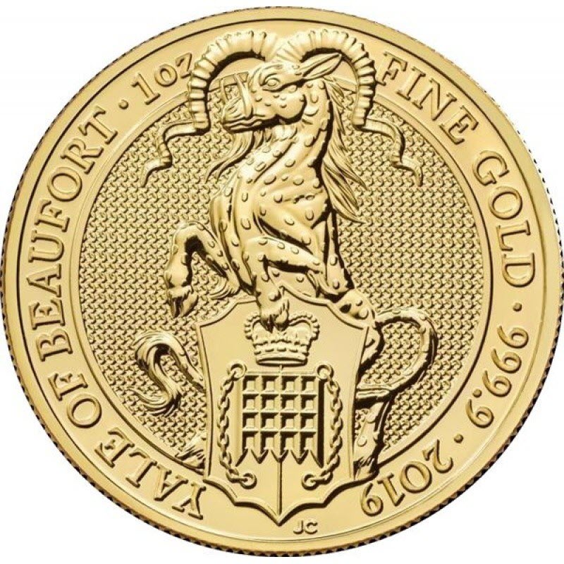 На этой золотой монете весом в одну унцию изображен еще один оригинальный портрет дизайнера монетного двора Royal Mint Джоди Кларк. Йель был изображен как существо царственного роста, редкое и великолепное. Его рога, его самая яркая особенность, являются фокусом в дизайне, сохраняя его тайну и древнее наследие.