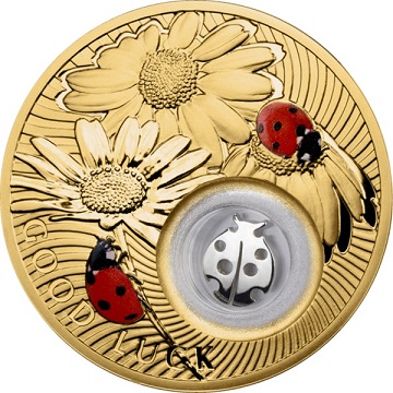 На реверсе монеты изображены две красных божьих коровки. Еще одна божья коровка помещена внутри прозрачной капсулы в нижней части монеты. Имеется также надпись-пожелание: "GOOD LUCK" (Удачи!).