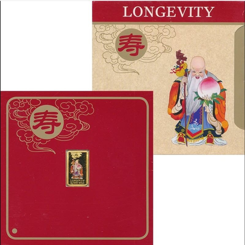 В верхней части реверса монеты помещен соответствующий иероглиф, обозначающий на китайском языке «Долголетие». По центру реверса находится цветное изображение соответствующего мифологического персонажа-божества. В нижней части указано название символа на английском языке - "Longevity", вес монеты и драгоценный металл.