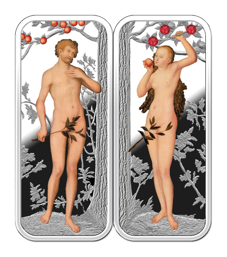 На реверсе монет изображены Адам и Ева в Эдемском саду.