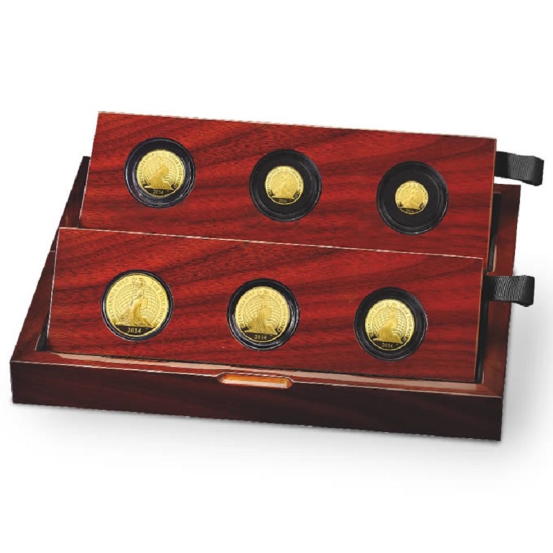 Потрясающий набор из 6-ти золотых монет — Британии, выпущенный в 2014 году. Монеты упакованы в деревянный футляр и имеют сертификат подлинности. Ограниченный тираж — всего 250 штук.
