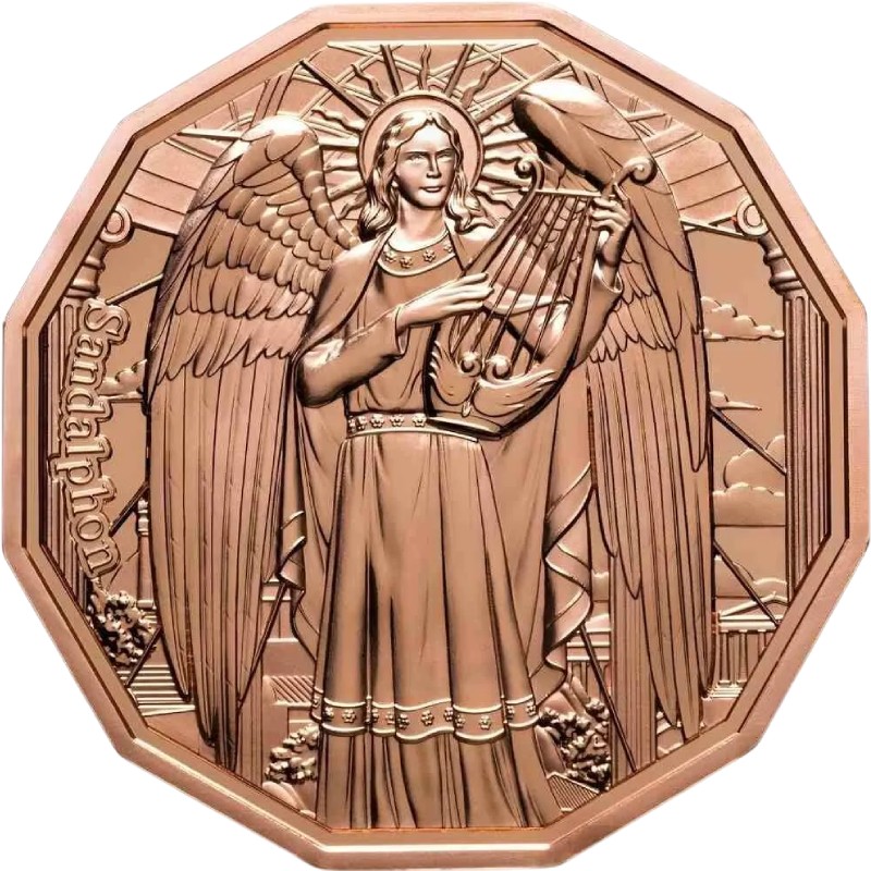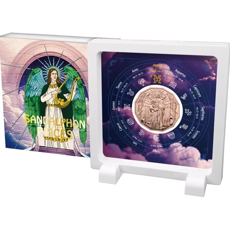 Эта чудесная медная монета необычной двенадцатиугольный формы из серии «Знаки зодиака. Архангелы» посвящена Сандальфону - ангелу музыки, знаку зодиака – рыбы.