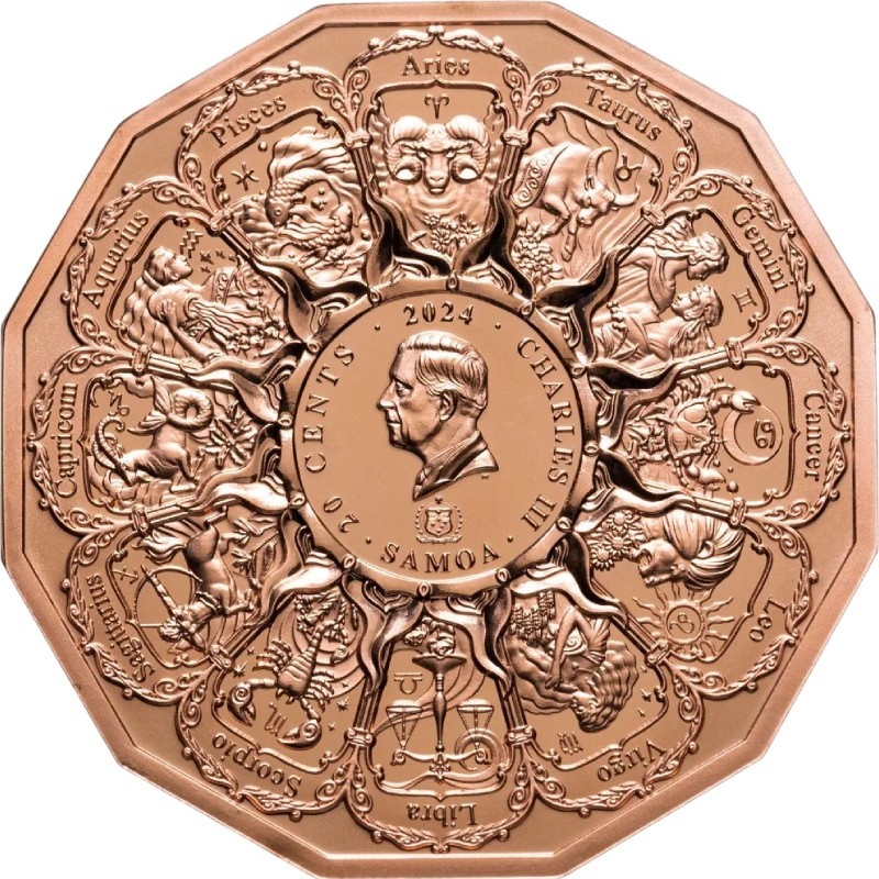 На аверсе монеты изображена круговая композиция из 12 знаков зодиака, каждый из которых заключен в отдельный орнаментальный медальон с соответствующим символом, изображением, а также названием на латинском языке. В центре расположен портрет Его Величества Чарльза III, дизайнера Глина Дэвиса (GD). Под ним - герб Самоа. Вокруг портрета по кругу надписи: SAMOA ∙ 20 CENTS ∙ 2024 ∙ CHARLES III (страна-эмитент, номинал, год чеканки, Чарльз III)