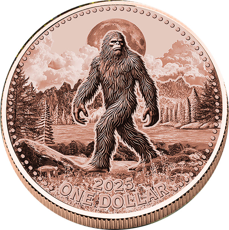 На реверсе изображен Снежный человек на фоне дикой природы. Внизу надпись: 2025 ONE DOLLAR (год чеканки, номинал).