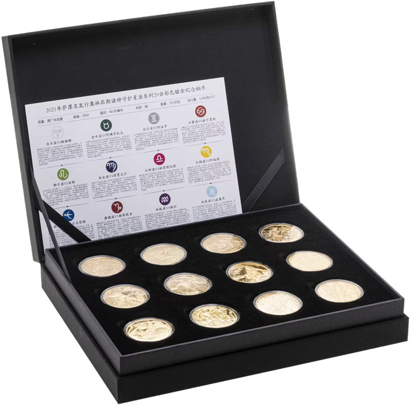 Этот чудесный набор из 12 монет посвящен связи знаков Зодиака с богами древнегреческого Олимпа. Поставляется в оригинальном футляре с сертификатом подлинности. Тираж: 3000 штук.