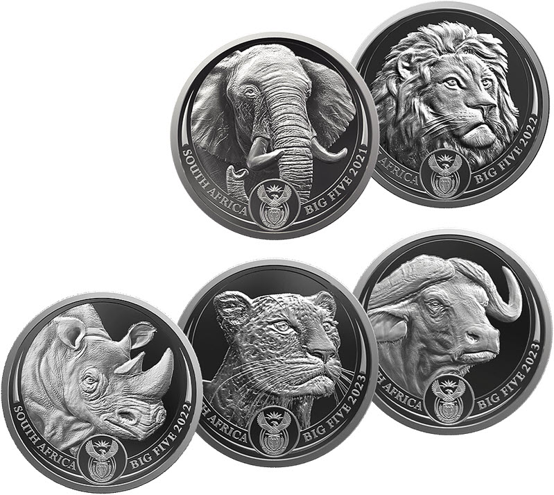 Впервые в 2019 году Южноафриканский монетный двор выпустил серию монет, посвященных Большой пятерке. Животные, известные как «большая пятерка» (слон, лев, буйвол, носорог, леопард), считаются эмблемами и послами этой богатой культурой страны и представляют африканскую фауну. Это отличная серия для коллекционеров монет, любителей природы и всех, кто ценит великое искусство драгоценных металлов. Серия прославляет дикую природу Африки, показывая силу и красоту Большой пятерки. Аверс и реверс разработан дизайнером Полем Ботесом (PB, Paul Botes). У них качество пруф. Каждая монета поставляются в роскошном деревянном футляре с пронумерованным сертификатом подлинности. Тираж: 500 штук.