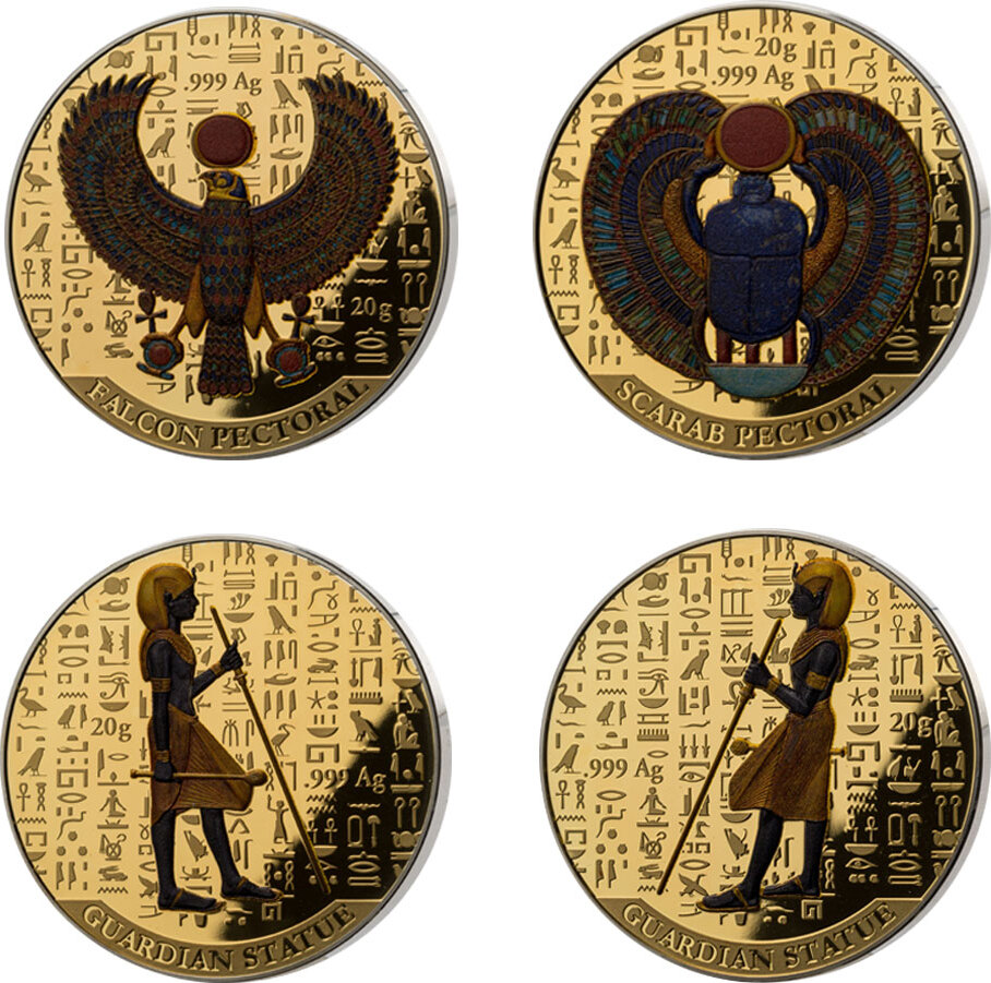 На реверсе каждой серебряной монеты изображен артефакт, найденный в гробнице самого молодого фараона египетской империи — он умер всего в 18 лет! Открытие было сделано археологом Говардом Картером 29 ноября 1922 года в Долине царей, недалеко от города Луксор на юге Египта. Каждая монета имеет специальные функции: дополнительная чеканка, чеканка микрокласса, нанесение аутентичного цвета, нанесение полупрозрачного цвета, нанесение микрозолота 999 пробы и нанесение матового золота.