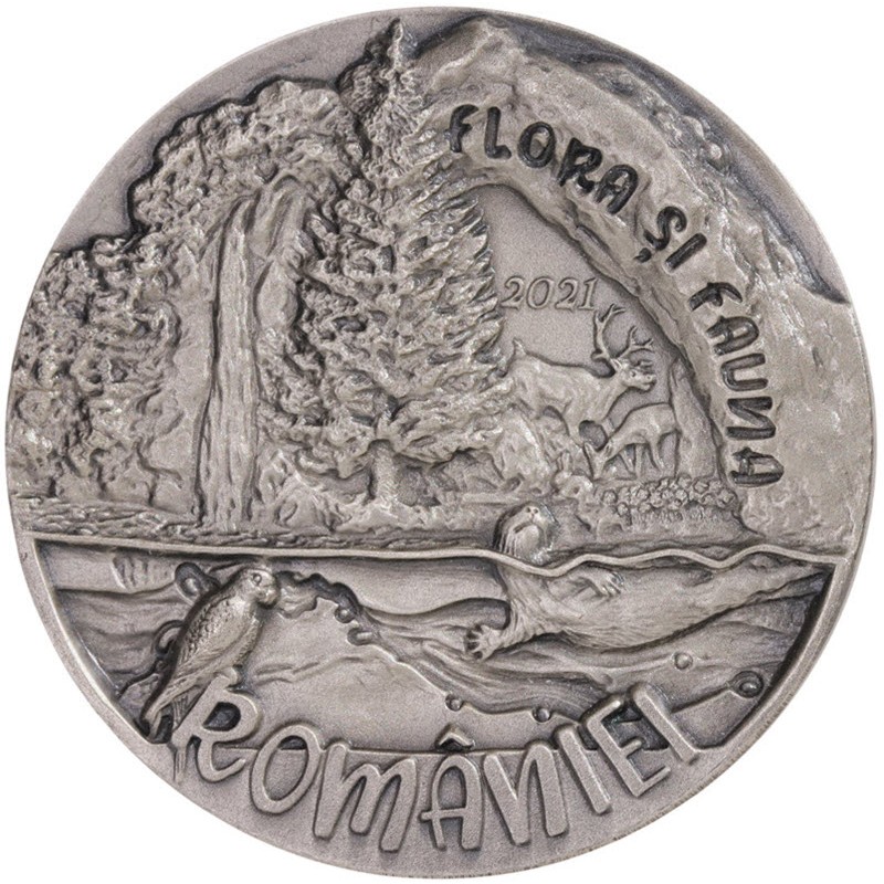 На аверсе изображена лесная чаща на берегу реки с образами оленей, выдры и красной пустельги. Вдоль канта надпись: FLORA ȘI FAUNA 2021 ROMANIEI (серия, год чеканки).
