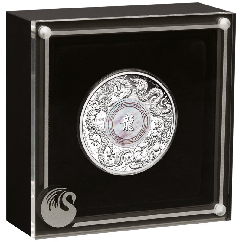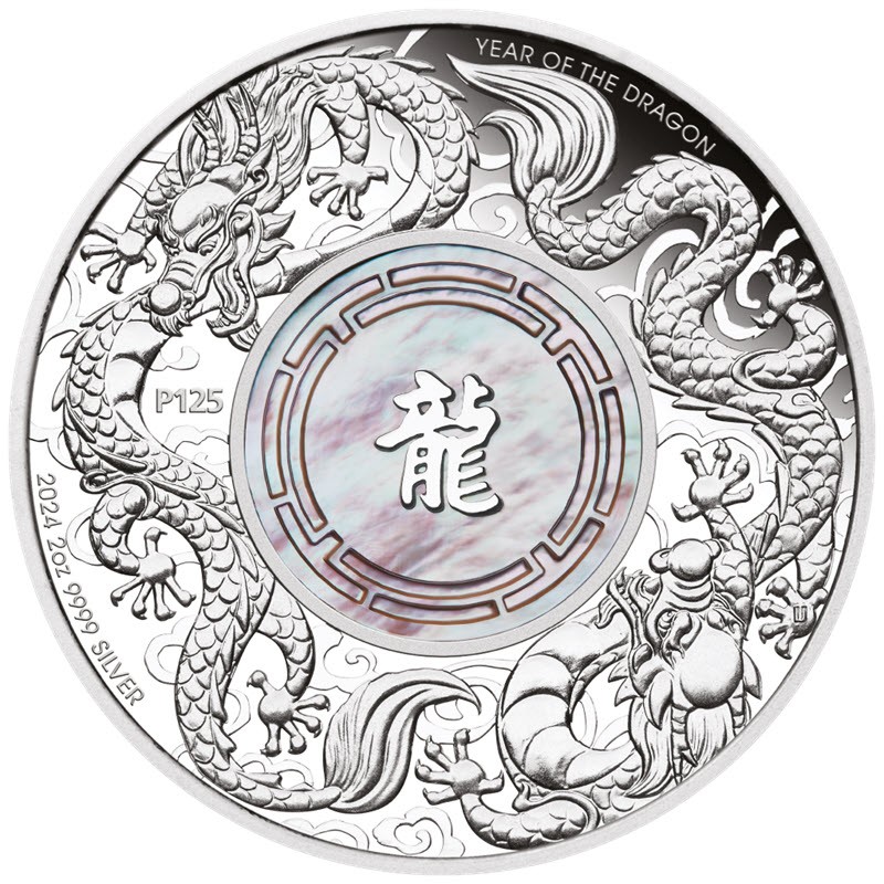 Серебряная монета из серии от Пертского монетного двора Австралии весом 2 унции посвящена символу 2024 года - Дракону. У нее вставка из перламутра.