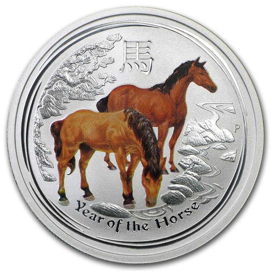 На реверсе изображен символ 2014 года - Лошадь, китайский иероглиф, обозначающий соответствующее животное, справа буквой "P" обозначен Пертский монетный двор.