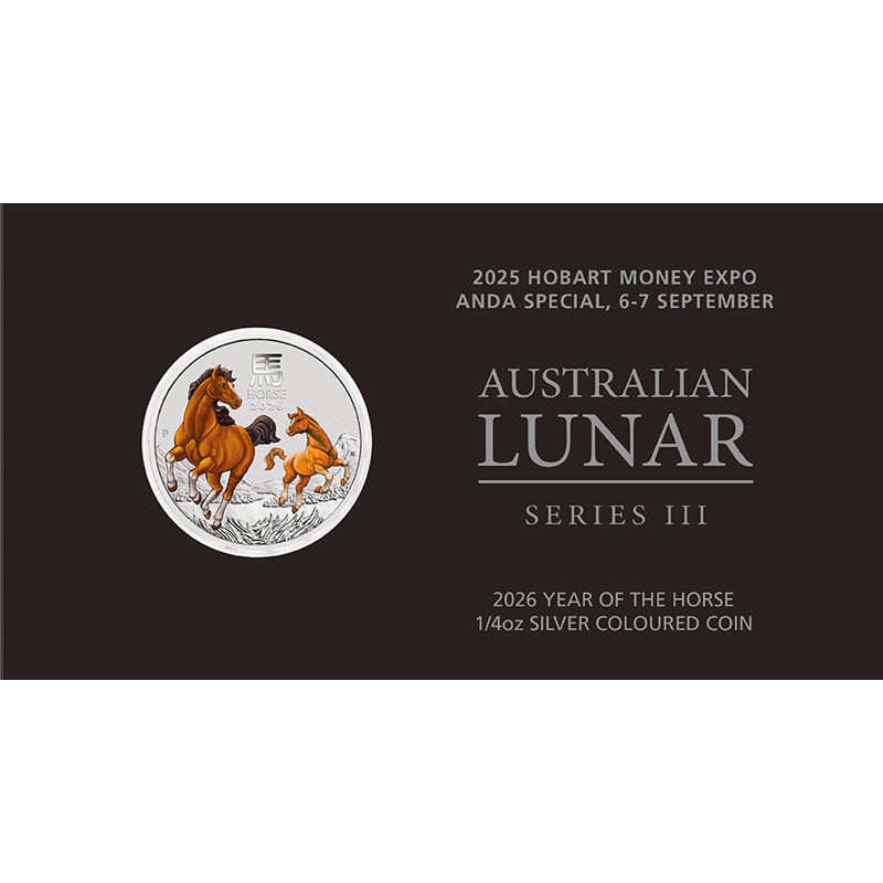 Серебряная монета из серии "Лунный календарь - III" от Пертского монетного двора Австралии весом в 1/4 тройской унции посвящена символу 2026 года – Лошади. Специальный выпуск к выставке монет в Хобарте (Hobart Money Expo). У нее качество BU и селективная окраска. Поставляется в блистере с датами проведения выставки Hobart Money Expo 2025.