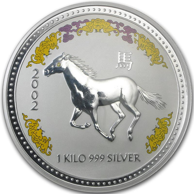 На реверсе изображена скачущая лошадь работы Трэвиса Фарли (Travis Farley) с глазом из позолоченного бриллианта весом 0.02 карата. Слева дата: 2002 (год чеканки), вверху справа китайский иероглиф: 馬 (Лошадь), внизу: 1 KILO 999 SILVER (вес и проба серебра).