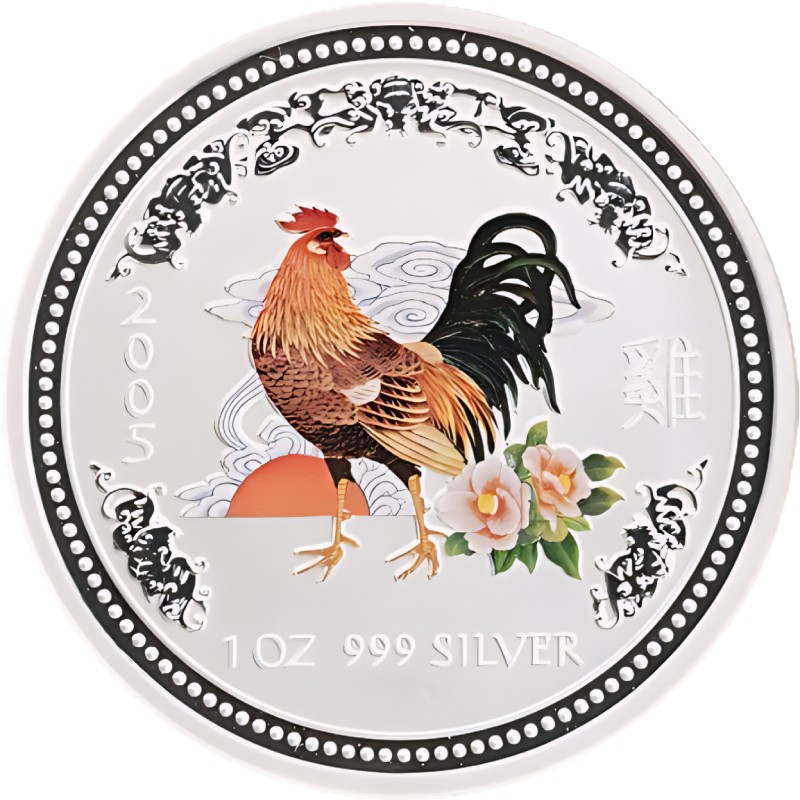 На реверсе изображен символ 2005 года - Петух, на фоне яркого восходящего солнца и цветов камелии. Справа: китайский иероглиф, обозначающий «Петух». Слева: 2005 (год чеканки). Внизу указаны вес и проба серебра: 1 OZ 999 SILVER.