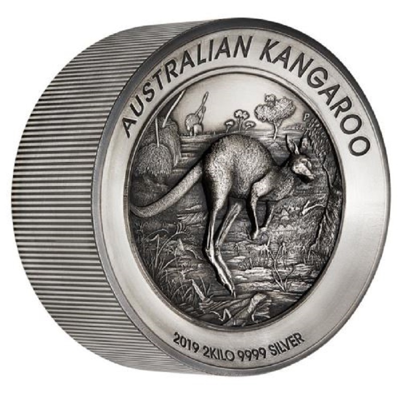 Серебряная монета весом 2 килограмма, выполненная в античном стиле, чтобы передать глубину деталей в реверсном дизайне, на котором изображен кенгуру, прыгающий через австралийский пейзаж. Ограниченный тираж.